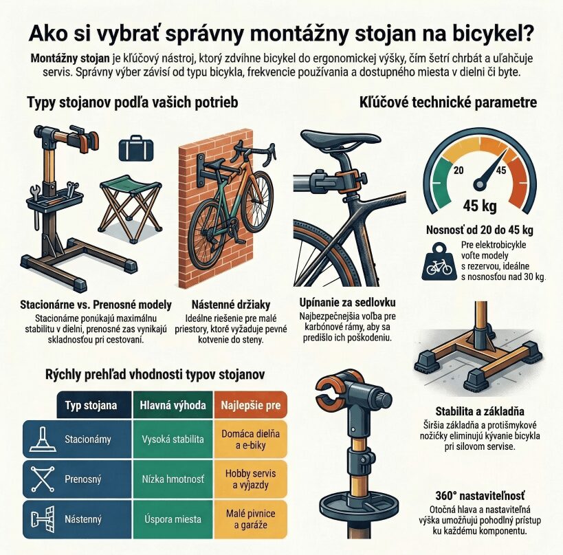 V tomto prehľade si ukážeme, aké typy montážnych stojanov existujú, ktoré technické parametre sú pri výbere rozhodujúce, ako prispôsobiť stojan priestoru aj typu údržby a čo robiť, aby vám slúžil spoľahlivo dlhé roky. Ak si skladáte vlastnú domácu výbavu, pomôcť vám môžu aj naše témy, ako ako zistiť veľkosť kolesa na bicykli, mini kompresor na bicykel alebo lepiaca sada na opravu defektu na bicykli.