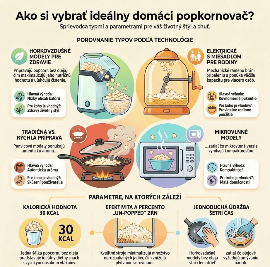 Pri výbere je preto dôležité zvážiť, či uprednostňujete čo najľahší snack, autentickú kinovú chuť, alebo maximálny komfort obsluhy a čistenia. V nasledujúcich odsekoch sa pozrieme na hlavné typy popkornovačov podľa prípravy a na to, komu ktorý z nich najviac vyhovuje.