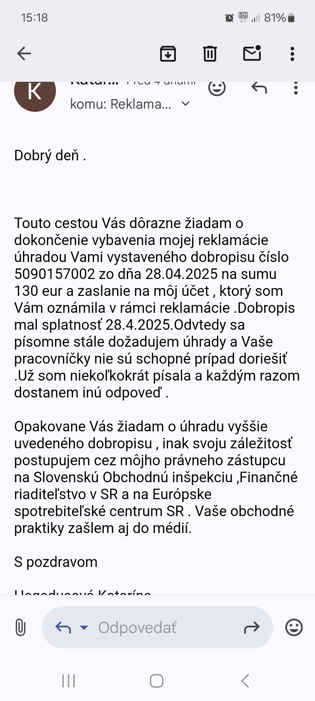 Mesiac vybavujem reklamaciu. Neviem sa dovolať nového tovaru.