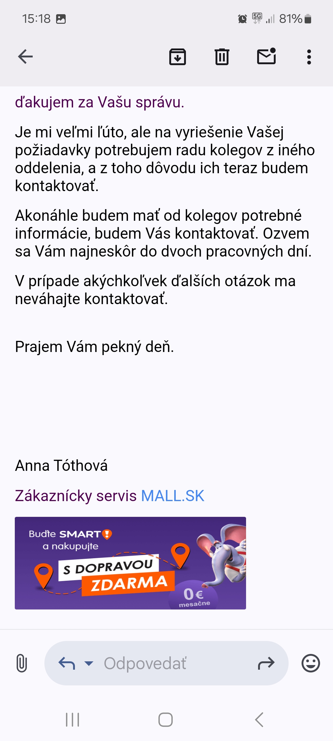 Prosím Vás obchádzajte a nekupujte na (Mall) teraz uz Allegro, sú to klamári a zavádzajú, dala som reklamovať tovar, ktorý mi vyreklamovali a dodnes mi neprišli peniaze. Nemám ani tovar ani peniaze, mali mi vrátiť 130 eur. Nemáte s kým ani komunikovať, na každý email odpovedia, že to prezistia do dvoch prac. dní sa ozvú….Neozvú ….Ľudkovia fakt nekupujte na Allegro z ďaleka ich obchádzajte. Prikladám aj trošku komunikáciu cez email, neviem sa dostať k svojim peniazom.